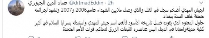 وقال في تغريدة عبر "تويتر" رصدها "المشهد العربي": "لجيش المهدي أضخم سجل في القتل والذي وصل ملايين الشهداء عامي 2006 و2007 وتشهد لجرائمه منطقة خلف السدة ببغداد. حاول .... الذي يقوده غسل تاريخه الأسود فألغى اسم جيش المهدي واستبدله بسرايا السلام في أكبر كذبة حديثة وإمعانا في الدجل البس عناصره القبعات الزرق لتحاكي قوات الأمم المتحدة".