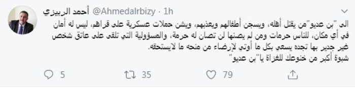 وقال في تغريدة عبر "تويتر" رصدها "المشهد العربي": "إلى بن عديو من يقتل أهله، ويسجن أطفالهم ويعذبهم، ويشن حملات عسكرية على قراهم، ليس له أمان في أي مكان، للناس حرمات ومن لم يصنها لن تصان له حرمة، والمسؤولية التي تلقى على عاتق شخص غير جدير بها تجده يسعي بكل ما أوتي لإرضاء من منحه ما لا يستحقه. شبوة أكبر من خنوعك للغزاة يا بن عديو".