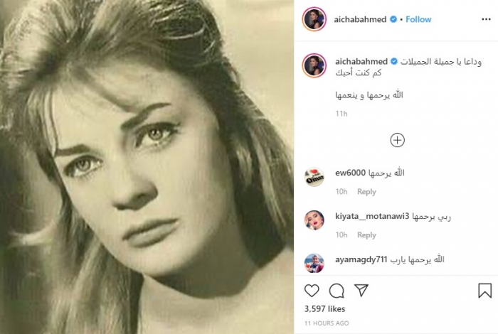 ونشرت عبر حسابها الرسمي بموقع إنستجرام، صورة للفنانة الراحلة، وعلقت: "وداعا يا جميلة الجميلات، كم كنت أحبك، الله يرحمها وينعمها".
