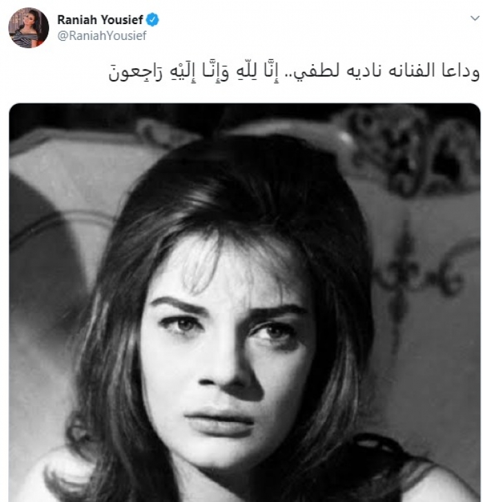 ونشرت رانيا صورة للراحلة نادية لطفي، عبر حسابها الرسمي بموقع "تويتر"، وعلقت: "وداعا الفنانة نادية لطفي، إنا لله وإنا إليه راجعون".