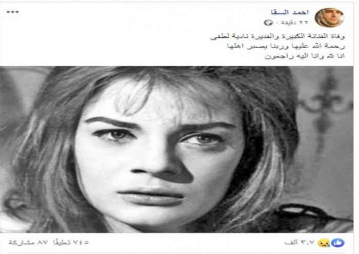 وشارك السقا جمهوره ومتابعيه صورة لـ"نادية"، وأرفق معها تعليقًا، إذ قال: "وفاة الفنانة الكبيرة والقديرة نادية لطفى، رحمة الله عليها، وربنا يصبر أهلها، إنا لله وإنا اليه راجعون".