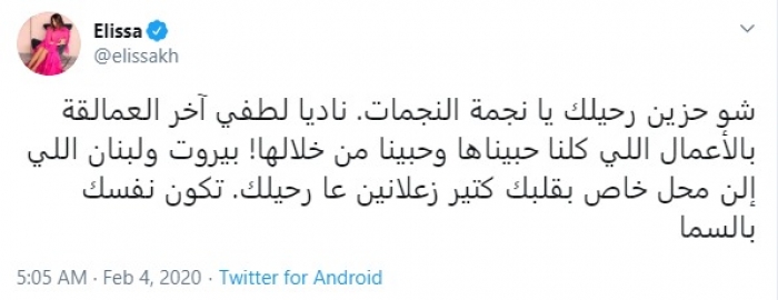 وكتبت إليسا تغريدة، عبر حسابها الرسمي بموقع "تويتر":" شو حزين رحيلك يا نجمة النجمات، نادية لطفي آخر العمالقة بالأعمال اللي كلنا حبيناها وحبينا من خلالها، بيروت ولبنان اللي إلن محل خاص بقلبك كتير زعلانين عا رحيلك، تكون نفسك بالسما".