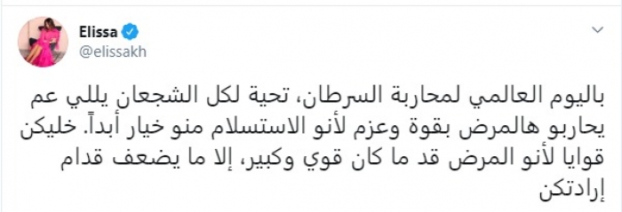 أحيت النجمة اللبنانية إليسا ذكرى اليوم العالمي للسرطان الذي يوافق اليوم الثلاثاء 4 فبراير من كل عام، و قالت عبر حسابها على "تويتر"، "باليوم العالمي لمحاربة السرطان، تحية لكل الشجعان يللى عم يحاربو هالمرض بقوة وعزم لأنو الاستسلام منو خيار أبداً. خليكن قوايا لأنو المرض قد ما كان قوي وكبير، إلا ما يضعف قدام إرادتكن".