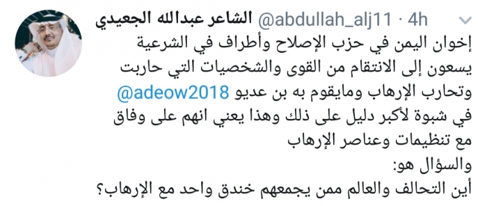 وكتب الجعيدي، في تغريدة له عبر موقع التواصل الاجتماعي تويتر، تابعها المشهد العربي: "إخوان اليمن في حزب الإصلاح وأطراف في الشرعية يسعون إلى الانتقام من القوى والشخصيات التي حاربت وتحارب الإرهاب".