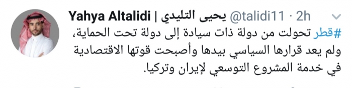 وكتب التليدي، في تغريدة له عبر موقع التواصل الاجتماعي تويتر، تابعها المشهد العربي: "قطر تحولت من دولة ذات سيادة إلى دولة تحت الحماية".