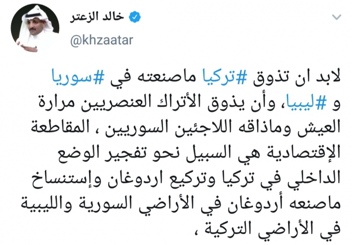 وكتب الزعتر، في تغريدة له على موقع التواصل الاجتماعي تويتر، تابعها المشهد العربي: "لابد أن تذوق تركيا ما صنعته في سوريا وليبيا، وأن يذوق الأتراك العنصريين مرارة العيش وما ذاقه اللاجئين السوريين".