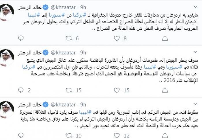 توقع المحلل السياسي السعودي خالد الزعتر، اليوم، تجدد الخلافات داخل الجيش التركي جراء سقوط قتلى لقوات الرئيس التركي رجب طيب أردوغان في ليبيا وسوريا، مشيرًا إلى أن طموحاته في المنطقة العربية ما هي إلا انعكاس للصراع داخل بلاده.