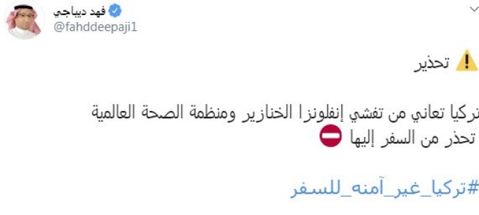 وكتب في تغريدة عبر "تويتر" رصدها "المشهد العربي": "تركيا تعاني من تفشي انفلونزا الخنازير ومنظمة الصحة العالمية تحذر من السفر إليها".