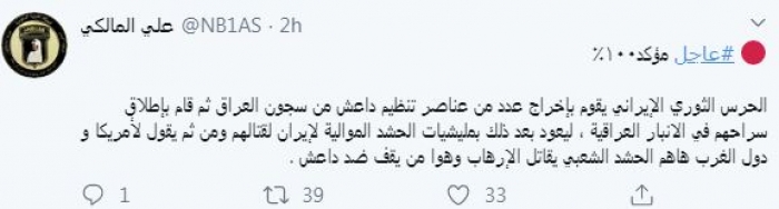 وقال في تغريدة عبر "تويتر" رصدها "المشهد العربي": "الحرس الثوري الإيراني يقوم بإخراج عدد من عناصر تنظيم داعش من سجون العراق ثم قام بإطلاق سراحهم في الأنبار العراقية، ليعود بعد ذلك بمليشيات الحشد الموالية لإيران لقتالهم ومن ثم يقول لأمريكا ودول الغرب هاهم الحشد الشعبي يقاتل الإرهاب وهو من يقف ضد داعش".