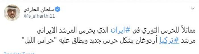 وقال في تغريدة عبر "تويتر" رصدها "المشهد العربي":"مماثلاً للحرس الثوري في إيران الذي يحرس المرشد الإيراني.. مرشد تركيا أردوغان يشكل حرس جديد ويطلق عليه حراس الليل".