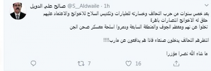 وقال في تغريدة عبر "تويتر" رصدها "المشهد العربي": "بعد خمس سنوات من حرب التحالف وخسارته للمليارات وتكديس السلاح للإخوانج والاعتماد عليهم. حقق له الإخوانج انتصارات باهرة. تخلوا عن نهم ومعظم الجوف والمنطقة السابعة ودمروا أسلحة معسكر صحن الجن. انتظرهم التحالف يدخلون صنعاء فإذا هم يدافعون عن مأرب. ما شاء الله نصرًا مؤزرًا".
