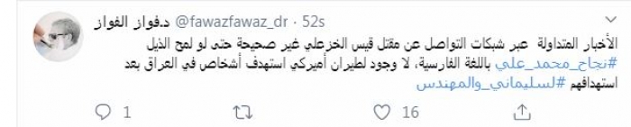 وقال في تغريدة عبر "تويتر" رصدها "المشهد العربي": "الأخبار المتداولة عبر شبكات التواصل عن مقتل قيس الخزعلي غير صحيحة حتى لو لمح الذيل نجاح محمد علي باللغة الفارسية، لا وجود لطيران أميركي استهدف أشخاص في العراق بعد استهدافهم لسليماني والمهندس".