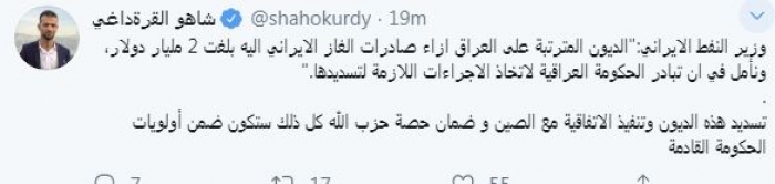 وقال في تغريدة عبر "تويتر" رصدها "المشهد العربي": "وزير النفط الإيراني : الديون المترتبة على العراق إزاء صادرات الغاز الإيراني إليه بلغت 2 مليار دولار، ونأمل في أن تبادر الحكومة العراقية لاتخاذ الاجراءات اللازمة لتسديدها. تسديد هذه الديون وتنفيذ الاتفاقية مع الصين وضمان حصة حزب الله كل ذلك ستكون ضمن أولويات الحكومة القادمة".