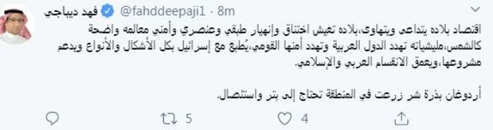 وقال في تغريدة عبر "تويتر" رصدها "المشهد العربي": "اقتصاد بلاده يتداعى ويتهاوى، بلاده تعيش اختناق وانهيار طبقي وعنصري وأمني معالمه واضحة كالشمس، مليشياته تهدد الدول العربية وتهدد أمنها القومي، يُطبع مع إسرائيل بكل الأشكال والأنواع ويدعم مشروعها، ويعمق الانقسام العربي والإسلامي. أردوغان بذرة شر زرعت في المنطقة تحتاج إلى بتر واستئصال".