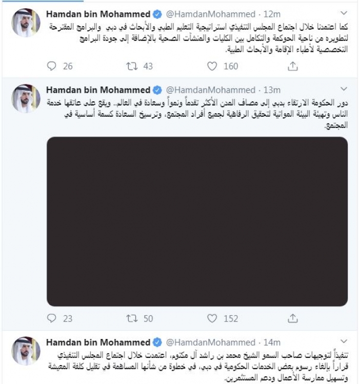 وقال في تغريدات عبر "تويتر" رصدها "المشهد العربي": "تنفيذاً لتوجيهات صاحب السمو الشيخ محمد بن راشد آل مكتوم، اعتمدت خلال اجتماع المجلس التنفيذي قراراً بإلغاء رسوم بعض الخدمات الحكومية في دبي، في خطوة من شأنها المساهمة في تقليل كلفة المعيشة وتسهيل ممارسة الأعمال ودعم المستثمرين".