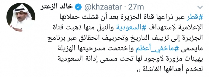 وكتب الزعتر، في تغريدة له على موقع التواصل الاجتماعي تويتر، تابعها المشهد العربي: "قطر عبر ذراعها قناة الجزيرة بعد أن فشلت حملاتها الإعلامية لاستهداف السعودية والنيل منها ذهبت قناة الجزيرة إلى تزييف التاريخ وتحرييف الحقائق عبر برنامج ما يسمى (ما خفي أعظم)".