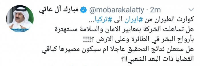 وكتب آل عاتي، في تغريدة له عبر موقع التواصل الاجتماعي تويتر، تابعها المشهد العربي: "كوارث الطيران من إيران إلى تركيا"، متسائلا: "هل تساهلت الشركة بمعايير الأمان والسلامة مستهترة بأرواح البشر في الطائرة وعلى الأرض؟".