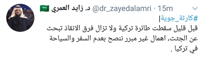 وكتب العمري، في تغريدة له عبر موقع التواصل الاجتماعي تويتر، تابعها المشهد العربي: "كارثة جوية.. قبل قليل سقطت طائرة تركية ولا تزال فرق الانقاذ تبحث عن الجثث".
