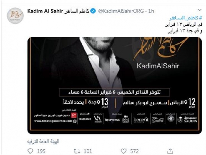 ونشر كاظم، بوستر الحفلين عبر حسابه على "تويتر"، وعلق: "في الرياض 12 فبراير، وفي جدة 13 فبراير".