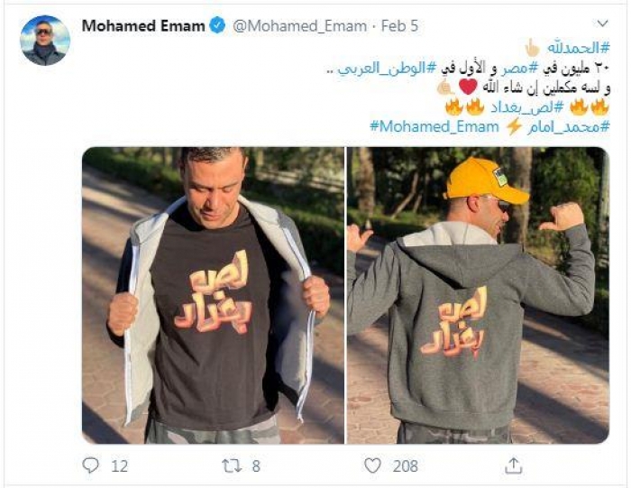 ونشر محمد إمام، صورا ارتدى فيها تيشيرات مكتوب عليها اسم الفيلم عبر حسابه على"تويتر"، وعلق: "الحمد لله 20 مليون في مصر، والأول في الوطن العربي، ولسه مكملين إن شاء الله، لص بغداد".