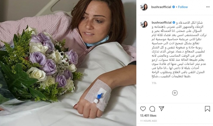 نشرت الفنانة بشرى، عبر حسابها الرسمي بموقع إنستجرام، صورة لها من داخل المستشفى، بعد تعرضها لوعكة صحية منذ أيام.
