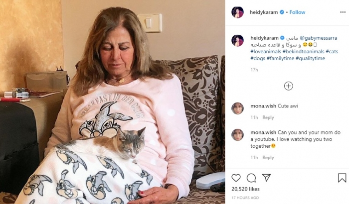 نشرت الفنانة هيدي كرم، عبر حسابها الرسمي بموقع إنستجرام، صورة جديدة لوالدتها بصحبة قطتها "سوكا".