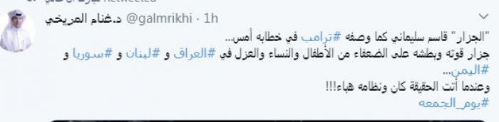 وكتب في تغريدة عبر "تويتر" رصدها "المشهد العربي": "الجزار قاسم سليماني كما وصفه ترامب في خطابه أمس... جزار قوته وبطشه على الضعفاء من الأطفال والنساء والعزل في العراق ولبنان وسوريا واليمن... وعندما أتت الحقيقة كان ونظامه هباء".