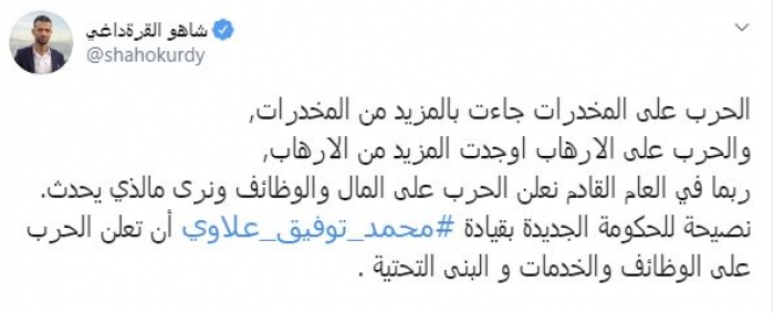 طالب الكاتب الصحفي العراقي شاهو القرةداغي، اليوم، رئيس الوزراء العراقي محمد توفيق علاوي بمحاربة الفساد والإرهاب والمخدرات بالعراق.