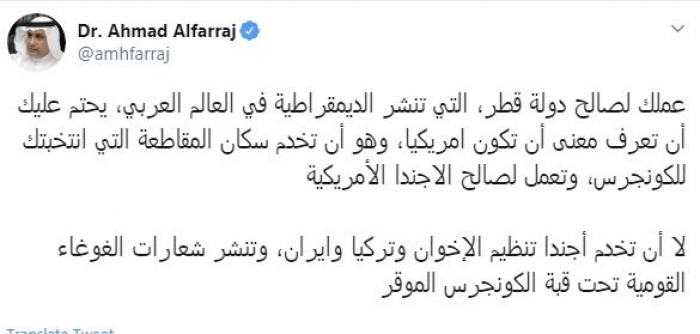 وقال في تغريدة عبر "تويتر" رصدها "المشهد العربي": "عملك لصالح دولة قطر، التي تنشر الديمقراطية في العالم العربي، يحتم عليك أن تعرف معنى أن تكون أمريكيًا، وهو أن تخدم سكان المقاطعة التي انتخبتك للكونجرس، وتعمل لصالح الأجندة الأمريكية.. لا أن تخدم أجندة تنظيم الإخوان وتركيا وإيران، وتنشر شعارات الغوغاء القومية تحت قبة الكونجرس الموقر".