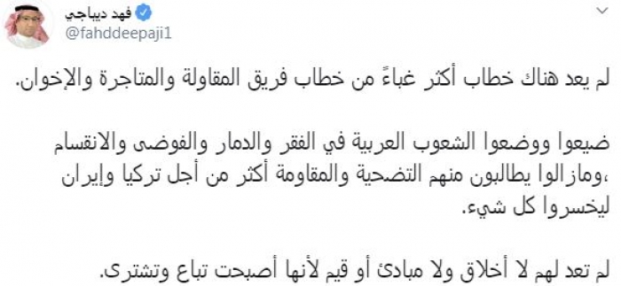 وقال في تغريدة عبر "تويتر" رصدها "المشهد العربي": "لم يعد هناك خطاب أكثر غباءً من خطاب فريق المقاولة والمتاجرة والإخوان. ضيعوا ووضعوا الشعوب العربية في الفقر والدمار والفوضى والانقسام ،ومازالوا يطالبون منهم التضحية والمقاومة أكثر من أجل تركيا وإيران ليخسروا كل شيء. لم تعد لهم لا أخلاق ولا مبادئ أو قيم لأنها أصبحت تباع وتشترى".