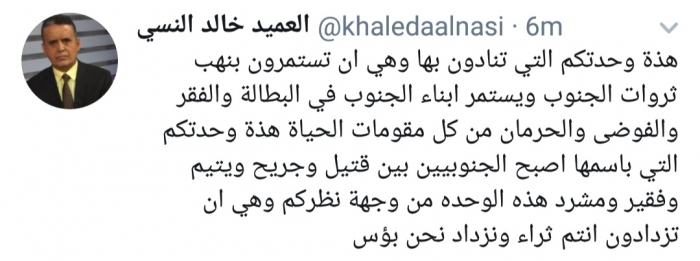 وكتب النسي، في تغريدة له عبر موقع التواصل الاجتماعي تويتر، تابعها المشهد العربي: "هذه وحدتكم التي تنادون بها وهي أن تستمروا بنهب ثروات الجنوب ويستمر أبناء الجنوب في البطالة والفقر والفوضى والحرمان من كل مقومات الحياة".