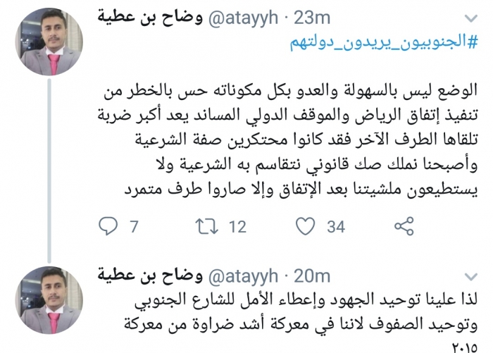 وكتب بن عطية، في تغريدة له على موقع التواصل الاجتماعي تويتر، تابعها المشهد العربي: "الوضع ليس بالسهولة والعدو بكل مكوناته حس بالخطر من تنفيذ اتفاق الرياض والموقف الدولي المساند يعد أكبر ضربة تلقاها الطرف الآخر".