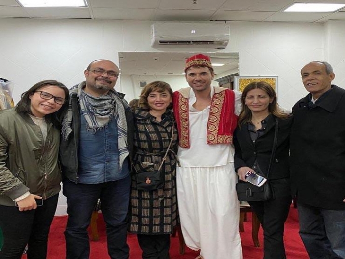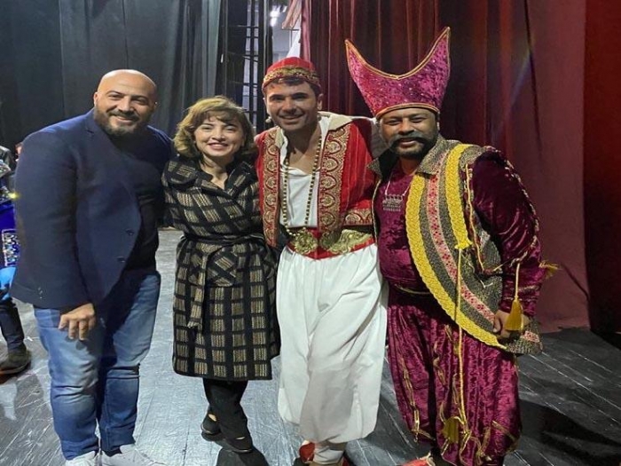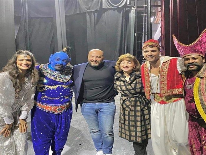 ساندرا نشأت تزور فريق عمل مسرحية علاء الدين في أول عروضه في مصر
