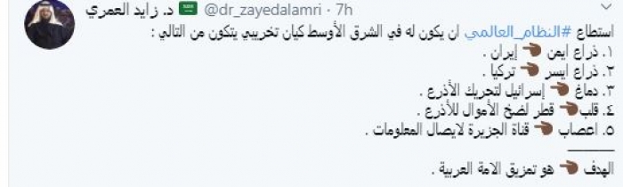 وقال في تغريدة عبر "تويتر" رصدها "المشهد العربي": "استطاع النظام العالمي أن يكون له في الشرق الأوسط كيان تخريبي يتكون من التالي ذراع أيمن إيران.. ذراع أيسر تركيا.. دماغ إسرائيل لتحريك الأذرع.. قلب قطر لضخ الأموال للأذرع.. أعصاب قناة الجزيرة لإيصال المعلومات.. الهدف هو تمزيق الامة العربية".