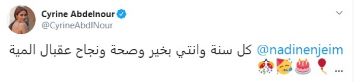 هنأت الفنانة سيرين عبدالنور، الفنانة اللبنانية نادين نجيم بعيد ميلادها الـ36، الموافق اليوم 7 فبراير الجاري.