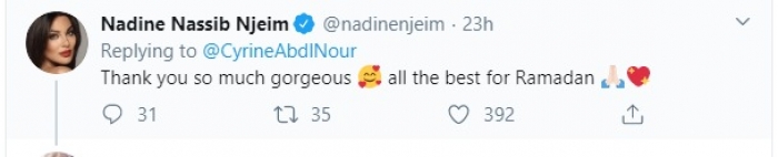 لترد عليها نادين قائلة :شكرصا كثيرًا أيتها الجميلة.. كل التوفيق في موسم رمضان المقبل".