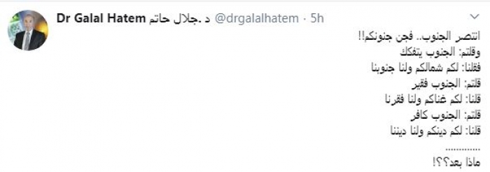 وقال في تغريدة عبر "تويتر" رصدها "المشهد العربي": "انتصر الجنوب.. فجن جنونكم!! وقلتم: الجنوب يتفكك.. فقلنا: لكم شمالكم ولنا جنوبنا.. قلتم: الجنوب فقير.. قلنا: لكم غناكم ولنا فقرنا.. قلتم: الجنوب كافر.. قلنا: لكم دينكم ولنا ديننا.. فماذا بعد؟".