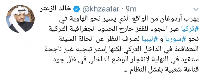 وكتب الزعتر، في تغريدة له على موقع التواصل الاجتماعي تويتر، تابعها المشهد العربي: "يهرب أردوغان من الواقع الذي يسير نحو الهاوية في تركيا عبر اللجوء للقفز خارج الحدود الجغرافية التركية نحو سوريا وليبيا لصرف النظر عن الحالة السيئة المتفاقمة في الداخل التركي".