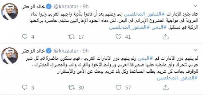 وكتب في تغريدات عبر "تويتر" رصدها "المشهد العربي": "لم ينتهي دور الإمارات في اليمن ولم ينتهي دور الإمارات العربي، فهي ستكون حاضرة في كل شبر عربي تتحرك وفق ما يمليه عليها ضميرها العربي وروابط الإخوة والقرى والدم والمصري المشترك ، للوقوف بجانب كل عربي يطلب المساعدة وكل بلد عربي يبحث عن الأمن والاستقرار".