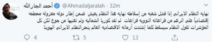 وكتب في تغريدة عبر "تويتر" رصدها "المشهد العربي": "نهاية النظام الإيراني إذا فشل شعبه من إسقاطه نهايه هذا النظام يعيش ضمن إطار دولة معزولة محطمة تقتصاديآ علي الرغم من فزاعاته النووية فزاعات لم تفد كوريا الشمالية ولم تغنيها من جوع لكن كل المؤشرات تقول النظام سيسقط كلما اشتدت أزماته الاقتصادية العالم ينحرالنظام الإيراني الهوينا".