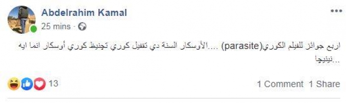 وكتب كمال: "أربع جوائز للفيلم الكوري (parasite)، الأوسكار السنة دي تقفيل كوري تچنيط كوري أوسكار انما إيه.. نينيچا".