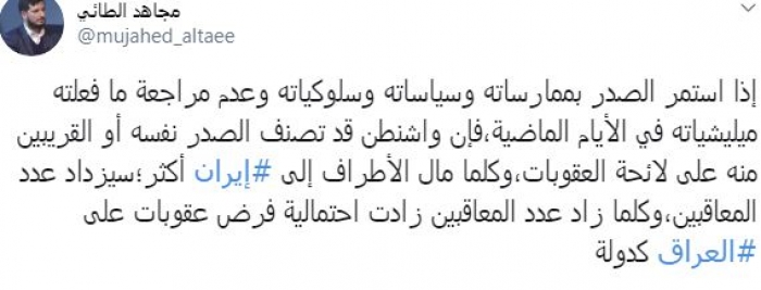 وقال في تغريدة عبر "تويتر" رصدها "المشهد العربي": "إذا استمر الصدر بممارساته وسياساته وسلوكياته وعدم مراجعة ما فعلته ميليشياته في الأيام الماضية، فإن واشنطن قد تصنف الصدر نفسه أو القريبين منه على لائحة العقوبات، وكلما مال الأطراف إلى إيران أكثر؛ سيزداد عدد المعاقبين، وكلما زاد عدد المعاقبين زادت احتمالية فرض عقوبات على العراق كدولة".