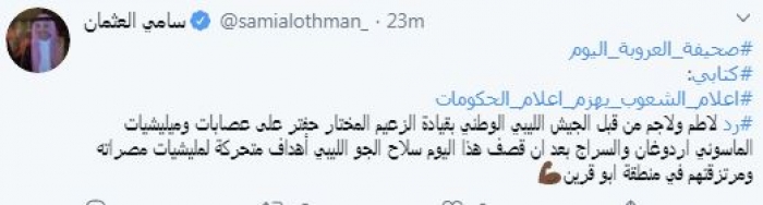 أشاد الإعلامي السعودي سامي العثمان، اليوم، بردع قوات الجيش الليبي للمليشيات الإرهابية في طرابلس -المدعومة من حكومة الوفاق الليبية-.