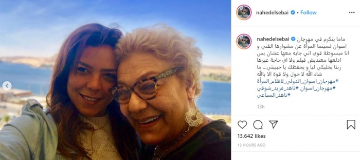 وكتبت في تعليقها على الصورة "ماما بتتكرم في مهرجان أسوان لسينما المرأة عن مشوارها الفني، وأنا مبسوطة قوي إني جاية معاها عشان بس ادلعها، معنديش فيلم ولا أي حاجة غيرها ربنا يخليكي ليا ويحفظك يا حبيبتي.. ما شاء الله لا حول ولا قوة إلا بالله".