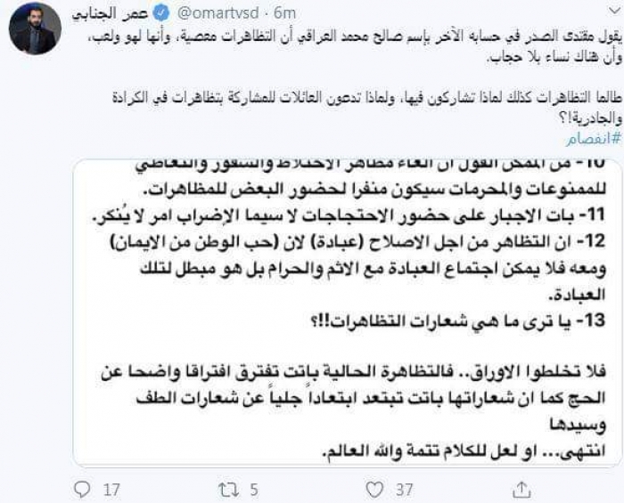 وكتب في تغريدة عبر "تويتر" رصدها "المشهد العربي": "يقول مقتدى الصدر في حسابه الآخر باسم صالح محمد العراقي أن التظاهرات معصية، وأنها لهو ولعب، وأن هناك نساء بلا حجاب. طالما التظاهرات كذلك لماذا تشاركون فيها، ولماذا تدعون العائلات للمشاركة بتظاهرات في الكرادة والجادرية!".