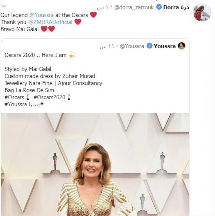 وأعادت درة نشر تغريدة لـ"يسرا"، وأرفقتها بتعليق: "أسطورتنا في حفل توزيع جوائز الأوسكار، برافو مي جلال، شكرًا مصمم الأزياء زهير مراد"