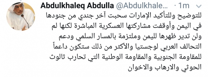 وكتب عبدالله، في تغريدة له عبر موقع التواصل الاجتماعي تويتر، تابعها المشهد العربي: "للتوضيح وللتأكيد الإمارات سحبت آخر جندي من جنودها في اليمن وأوقفت مشاركتها العسكرية المباشرة لكنها لم ولن تدير ظهرها لليمن وملتزمة بالمسار السلمي ودعم التحالف العربي لوجستيا".