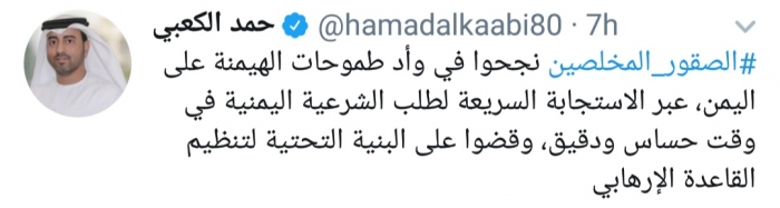 وكتب الكعبي، في تغريدة له عبر موقع التواصل الاجتماعي تويتر، تابعها المشهد العربي: "الصقور المخلصون نجحوا في وأد طموحات الهيمنة على اليمن، عبر الاستجابة السريعة لطلب الشرعية اليمنية في وقت حساس ودقيق، وقضوا على البنية التحتية لتنظيم القاعدة الإرهابي".