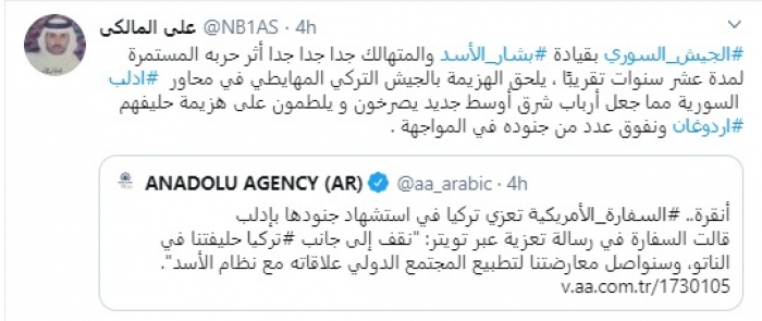 وقال في تغريدة عبر "تويتر" رصدها "المشهد العربي": "الجيش السوري بقيادة بشار الأسد والمتهالك جدًا أثر حربه المستمرة لمدة عشر سنوات تقريبًا، يلحق الهزيمة بالجيش التركي .... في محاور إدلب السورية مما جعل أرباب شرق أوسط جديد يصرخون ويلطمون على هزيمة حليفهم أردوغان ونفوق عدد من جنوده في المواجهة".
