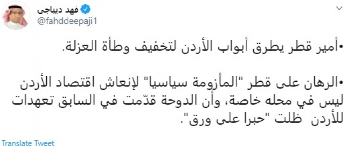 وقال في تغريدة عبر "تويتر" رصدها "المشهد العربي": "أمير قطر يطرق أبواب الأردن لتخفيف وطأة العزلة. الرهان على قطر المأزومة سياسيا لإنعاش اقتصاد الأردن ليس في محله خاصة، وأن الدوحة قدّمت في السابق تعهدات للأردن ظلت حبرًا على ورق".